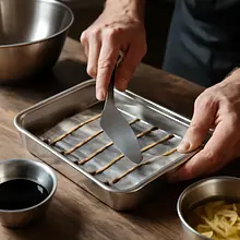 Soak the salted herring fillets: if you received whole fillets, check for bones and remove them with tweezers. Cut the fillets into pieces about 3–4 cm wide. Place the cut fillets in a large bowl and cover with cold water (about 500 ml). Put the bowl in the refrigerator and soak for 2 hours, changing the water every 30 minutes. After 2 hours, taste a small piece — it should be less salty but still flavorful; if it is too salty, continue soaking for another 30–60 minutes.