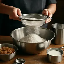 In a large bowl, sift 400 g of wheat flour together with 10 g of baking powder, 3 g of baking soda, 5 g of salt, and 3 g of cinnamon (the remaining cinnamon). Mix the dry ingredients with a spoon or whisk to ensure all the powders are evenly distributed. Check for any lumps of baking powder.