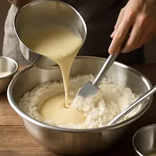 Pour the wet mixture into the bowl with the dry ingredients in one stream. Use a spatula and mix just until combined — fold from the center outwards until there are no dry streaks of flour (this will take about 20–30 seconds). The dough will be thick and sticky — do not mix too long to avoid developing gluten.