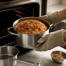 Cover the pot with a lid and place it in the preheated oven. Bake for 25 minutes covered at 200°C, then remove the lid and bake for another 15-20 minutes at 200°C, until the top is golden and a skewer inserted in the center comes out dry (if moist batter sticks to it, bake for another 3-5 minutes and check again). Total baking time: 40-45 minutes.