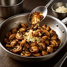 Add the mushrooms in a single layer: spread the sliced mushrooms evenly in the pan so they are not crowded (if the pan is too small, fry in batches). Fry without stirring for about 2 minutes to allow the mushrooms to brown on one side. Then stir every 30–60 seconds and fry for a total of 6–8 minutes, until the mushrooms significantly reduce in volume, release most of their water, and the edges start to golden. If a lot of liquid is coming from the pan, raise the heat for a moment to speed up evaporation.