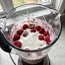In a large measuring cup or bowl, measure out natural yogurt and pour it into the blender. Add 120 ml of milk — the milk adds fluidity; if you want a very thick smoothie, add less milk (60 ml). If the yogurt is very thick and hard to mix, whisk it with a spoon before adding the raspberries.
