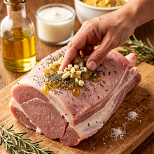 Take the pork neck out of the fridge 30 minutes before preparation to reach room temperature — this helps with even roasting. Pat the meat dry with a paper towel. If there is a thick layer of fat on the surface, lightly score it in a crosshatch pattern with a sharp knife (do not cut deeply into the meat, just the layer of fat), which will allow the fat to render and create a crispy crust. If you wish, tie the meat with kitchen twine every 3–4 cm to maintain an even shape while roasting.