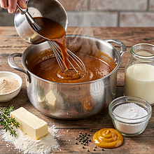 In the meantime, strain the sauce from the roasting pan through a sieve into a saucepan, discarding the vegetables and remnants. Allow the fat to rise to the surface; use a spoon to remove the excess fat (leave about 1 tablespoon for flavor). Melt the butter (50 g) over medium heat, add the flour (20 g), and stir for 1–2 minutes until a light roux aroma develops. Gradually pour the strained stock into the roux, whisking continuously to avoid lumps. Bring the sauce to a gentle boil, cook for 3–5 minutes until thickened, add the cream (200 g), and cook for another 2 minutes. Taste and season with salt and pepper. Finally, if needed, add chopped fresh thyme and 1 teaspoon of mustard (optional) — it will enhance the flavor of the sauce.
