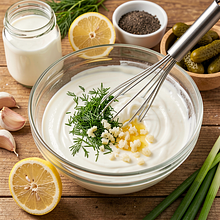 A delicate, fresh yogurt sauce with garlic and dill is a classic of Polish cuisine used as a dip for vegetables, an accompaniment to roasted potatoes and cold cuts, as well as a sauce for sandwiches and salads. The sauce combines a creamy base of natural yogurt with a sharper note of garlic, lemony freshness, and the aroma of dill — the result is a light, refreshing flavor perfect for spring gatherings and family snacks. Preparation is quick (about 10 minutes), and the ingredients are easily available in Polish stores. It can be served chilled or at room temperature; it pairs well with young seasonal vegetables such as asparagus or fresh cucumbers.