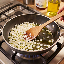 Heat a 24–26 cm skillet over medium heat. Pour in 30 g of olive oil and wait 30–45 seconds until it warms up slightly (it should glisten gently but not smoke). Add the chopped onion and sprinkle with a little salt (about 1 g) — the salt will speed up the release of juices. Sauté for 4–5 minutes, stirring with a wooden spoon, until the onion becomes translucent and soft (it should be clear and tender to the touch).