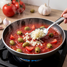 Add the chopped garlic to the pan and sauté for 30–40 seconds, stirring — the garlic should release its aroma but not brown. Then add the tomatoes (400 g). If using canned tomatoes, add the juices with a spoon; if using fresh, mix thoroughly. Increase the heat to medium-low and bring to a gentle simmer, then reduce the heat to low and cook for 10–12 minutes, uncovered, stirring every 2–3 minutes, until the sauce thickens and reduces in volume by about 1/3.
