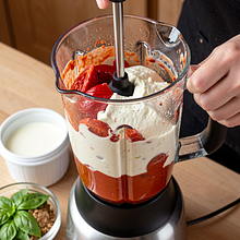 Remove the baking tray from the oven and let the vegetables cool for 5 minutes. Transfer the contents (along with the juices) to a blender. Add semi-fat cottage cheese and 18% cream. Add about 2/3 of the basil leaves, leaving the rest for decoration. Blend in short pulses until you achieve a smooth, creamy consistency — if you prefer a smooth sauce, blend longer; if you want chunks, blend briefly.