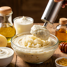 Add the grated horseradish to the bowl with the emulsified base. Use an immersion blender or a stand blender and blend on medium speed for 20–40 seconds, until the sauce is silky smooth or slightly grainy — depending on your preference. If you blend for a short time, the sauce will retain a pleasant texture and small pieces of horseradish.