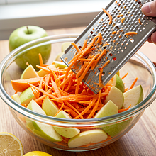 Grate the carrot on a medium grater directly into a large bowl so that the juice collects in the bowl. Then grate the apple on the same grater and add it to the carrot. If the apple starts to darken, immediately drizzle with lemon juice.