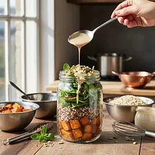 It's best to serve the salad in a clear container or jar to showcase the colorful layers. The dressing should be stored separately in a small, airtight container and drizzled over the salad just before eating. This way, the spinach will stay crisp. Just before serving, you can sprinkle fresh mint leaves for an extra refreshing touch.