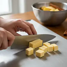 Take 150g of very cold butter out of the fridge. Cut it into small cubes (about 1x1 cm) with a sharp knife. Add the chopped butter to the bowl with the dry ingredients. Now, using only your fingertips, quickly rub the butter into the flour until the mixture resembles wet sand or crumbs. Try to work quickly so that the butter doesn't warm up from the heat of your hands.