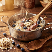Delicate duck breast skewers served with a sweet and sour blueberry sauce are a modern interpretation of Polish cuisine. The dish combines juicy meat with a crispy skin, seasonal blueberries, and the aroma of thyme and honey. Perfect for spring gatherings, when fresh fruits add lightness, and pearl barley creates a rustic, hearty side. Visually, the black skin of the duck contrasts with the shiny blueberry sauce and green mint leaves — served on a bed of creamy pearl barley with sautéed onions. The dish has distinct sweet and sour accents, with herbal notes and a crunchy texture.