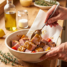 Prepare the marinade: in a medium bowl, combine canola oil, mustard, honey, and lemon juice. Crush the garlic with a knife or press it through a garlic press and add it to the bowl. Add sweet paprika, thyme, salt, and pepper. Mix with a spoon until you achieve a uniform emulsion (the mixture should be liquid, slightly sticky from the honey).
