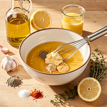 In a large bowl, combine rapeseed oil (60 g), lemon juice (50 ml), mustard (30 g), optionally honey (30 g), crushed garlic (15 g), salt (6 g), black pepper (2 g), smoked paprika (4 g), and thyme (4 g). Mix vigorously with a fork or whisk until the ingredients come together into a uniform light brown emulsion. Taste a bit of the marinade and adjust seasoning if necessary — remember that the marinade should be bold, as some of the flavor will penetrate the meat and vegetables.