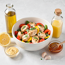 Aromatic skewers with chicken breast and seasonal vegetables: bell pepper, zucchini, mushroom, and onion. The marinade made from rapeseed oil, lemon juice, and mustard gives the meat tenderness and a slight acidity, while optional honey adds a subtle glaze during grilling. A perfect dish for a long weekend or picnic — colorful, easy to prepare on the grill or in the oven. Serve with millet or a salad of young vegetables and fresh parsley. The skewers are visually striking, with the contrast of juicy meat and crunchy vegetables, along with a distinct, slightly smoky aroma.