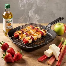 Preheat a grill pan or a regular non-stick pan over medium-high heat. Pour in canola oil (about 15 g) and spread it with a brush or paper towel. When the oil starts to shimmer slightly (after 30-40 seconds), place the skewers in the pan in a single layer. Fry for 1.5-2 minutes on each side — turn every 1.5-2 minutes until the oscypek is nicely browned and the fruits start to swell slightly and gain shine. The entire process for a single batch takes about 6-8 minutes.