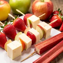 On each skewer, alternate: a piece of oscypek, a strawberry (half or whole fruit depending on size), a piece of apple, and a piece of rhubarb. Leave about 1 cm of the skewer free at the end for easy handling. Arrange the ingredients so that the oscypek is not at the end (this makes it easier to turn).