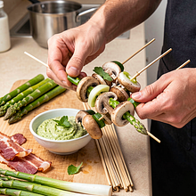 Skewer the vegetables onto the sticks: alternately thread a mushroom (cap facing out), a piece of asparagus, and a segment of spring onion onto each stick. If you are using bacon (optional), wrap a slice of bacon around the mushroom before skewering, so the bacon adheres gently to the vegetable while frying. Leave 1–2 cm of space at the ends of the sticks to make it easier to turn.