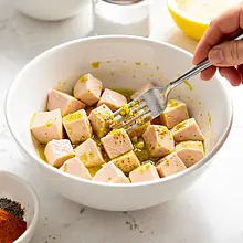 Place the chopped chicken pieces in the marinade: transfer the meat to a bowl with the marinade and thoroughly coat each piece with a fork or your hand. Cover with plastic wrap and set aside in the refrigerator or a cool place for 20–25 minutes — the meat should change color to a slightly whiter shade and take on a lemon aroma.