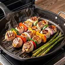 Preheat the grill or a large grill pan over medium-high heat. If using the oven, preheat to 200°C with the grill/convection function. Brush the grate or pan with a thin layer of oil. Place the skewers on the grill and cook for 10–12 minutes, turning every 3–4 minutes, until the vegetables are slightly charred and the meat is no longer pink in the center. When frying in a pan, keep the heat medium-high to achieve a nice crust.