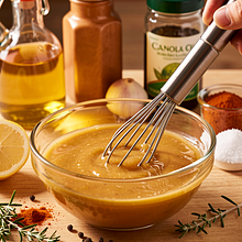 In a large bowl, combine canola oil, honey, and mustard. Add lemon juice, minced garlic, sweet paprika, thyme, salt, and pepper. Stir vigorously with a spoon until the honey is completely dissolved and the ingredients form a uniform emulsion.
