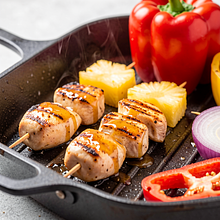 Chicken breast skewers with pineapple are a Polish-regional variation of the classic skewer — using easily accessible ingredients and a spring, slightly sweet-sour touch of pineapple. The dish combines juicy, marinated chicken breast with pieces of fresh pineapple and colorful bell pepper, seasoned with a honey-mustard marinade enriched with rapeseed oil and thyme. Perfect for a family dinner, a May Day grill, or as a main dish served with millet or a seasonal salad. Visually appetizing: golden pieces of meat interspersed with yellow pineapple and red bell pepper, drizzled with a shiny honey-mustard glaze.