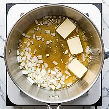Heat a small heavy-bottomed pot over medium heat, add butter (20 g). When the butter melts and starts to foam slightly (about 30-60 seconds), add the chopped onion. Sauté for 6-8 minutes, stirring with a wooden spoon, until the onion is translucent and soft, but not browned.
