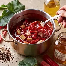 Add mustard seeds (5 g) to the pot and sauté for 1 minute until the seeds start to smell fragrant. Add sugar (100 g) and stir for 1-2 minutes until the sugar begins to dissolve. Add chopped rhubarb and apple cider vinegar (60 ml). Bring to a boil, then reduce the heat to low and cook for 15-20 minutes, stirring occasionally, until the chutney thickens and the fruits hold their shape — it should be slightly glossy and coat the spoon.