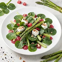 A modern, spring salad combining slightly sour sorrel with creamy goat cheese and sweet-sour rhubarb chutney. A dish inspired by fusion cuisine — the simplicity of Polish ingredients meets preservation techniques and flavor composition: the chutney adds depth to the salad, asparagus adds crunch, and nutty accents contrast with the delicate cheese. Serve as a light lunch, an appetizer for dinner, or as part of a larger menu; it pairs wonderfully with grilled chicken breast or fresh bread. Visually: green leaves, pink chutney, and white pieces of cheese create a modern, contrasting plate.