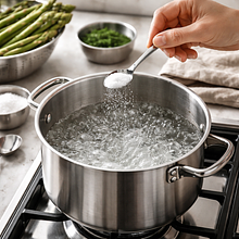Rinse the asparagus under cold running water, shaking the spears to remove any sand. Place one asparagus on a cutting board, holding one hand at the tip and the other hand at the base, and gently bend it until it snaps - the breaking point will indicate the tough, fibrous part. Lay all the asparagus next to each other and trim the breaking points or cut off 1–2 cm from the ends, so that they are all the same length. If the spears are thick (diameter >1.5 cm), peel the bottom 1/3 of the vegetable with a vegetable peeler, moving from the center of the spear downwards.