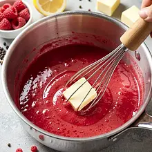 Strain the sauce through a fine sieve into a clean saucepan, pressing with a spoon to separate the seeds. Heat the remaining smooth sauce over very low heat. Add 20 g of cold diced butter and quickly whisk until the butter melts and emulsifies with the sauce. Taste and season with 2 g of pepper and 15–30 g of lemon juice (to taste) — the sauce should be balanced: sweet and sour.