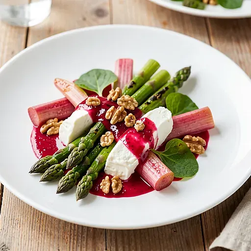 A light, spring salad combining green asparagus, tart rhubarb, and creamy goat cheese, drizzled with warm raspberry sauce. The dish merges Polish, seasonal ingredients with a modern fusion approach: contrasting temperatures (warm sauce, cool sorrel leaves), contrasting textures (soft red pieces of rhubarb, firm asparagus, crunchy nuts), and a balance of flavors (sweet-sour raspberry sauce with a hint of honey and balsamic vinegar). Great as an appetizer or a light main course for spring gatherings, serve with crispy bread or new potatoes. Visually appealing: the juicy green of the asparagus, pink rhubarb, and raspberry sauce create a modern plate composition.
