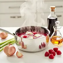 In a saucepan over medium heat, heat 1 tablespoon of rapeseed oil (15 g). Add the finely chopped shallot and sauté for 2–3 minutes until it becomes translucent (not browned). Add raspberries (250 g), 30 g of honey, and 15 g of balsamic vinegar. Bring to a boil and cook for 6–8 minutes, stirring, until the raspberries break down and the sauce thickens slightly.