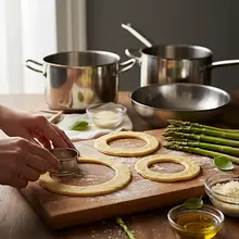 From the remaining dough, cut out another 4 circles of the same size. Then, using a smaller cutter (about 8 cm in diameter), cut out the center of each to create 4 rings. Gently brush the edges of the circles on the baking sheet with water or beaten egg and place the prepared rings on top. This will create raised edges – 'nests'.