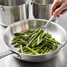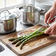 In a medium skillet, heat 1 teaspoon of canola oil (about 5 g). Add the chopped asparagus and sauté over medium heat for 2-3 minutes, stirring every 30 seconds — the goal is to lightly soften and enhance the flavor, do not cook until soft. When the asparagus loses its raw sheen and turns bright green, remove the skillet from the heat and let it cool for a few minutes.
