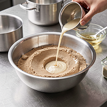 Make a well in the center of the bowl with the dry ingredients. Pour the wet ingredients into the dry and mix with a large spoon or spatula just until the ingredients are combined — the mixture should be slightly lumpy but without dry patches of flour. Add the grated cheese and gently fold it in.
