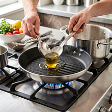Preheat a grill pan or a regular pan over medium-high heat. In a bowl, mix the rapeseed oil with 1/2 pinch of salt and 1 pinch of pepper. Gently coat the asparagus in the oil (you can use a kitchen brush or your hands). Fry the asparagus in the hot pan for 5–7 minutes, turning every 1–2 minutes, until they are tender inside (check by piercing with a fork — it should go in easily) and lightly browned on the outside.