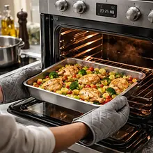 Preheat the oven to 200°C (top-bottom). Prepare a large baking tray lined with parchment paper or lightly greased. The high temperature will make the chickpeas crispy, and the thinly sliced beets will soften faster and caramelize slightly.