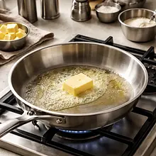 Heat a 24-26 cm skillet over medium heat. Add butter (30 g) and let it melt (30-45 s). Add sugar (30 g) and stir with a wooden spatula for 30 s, until the sugar starts to dissolve and forms a light, golden foam. Add apple slices evenly to the skillet — arrange them in a single layer as close together as possible. Drizzle with the remaining honey (30 g), add cinnamon (5 g) and lemon juice (remaining amount, about 10 g). Cook uncovered for 6-8 minutes, gently turning every 2 minutes, until the apples are soft when pierced with a fork, and the sauce thickens and takes on a caramel color.