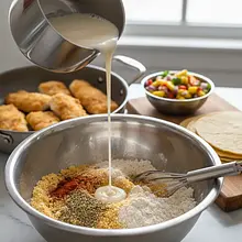 Now add the wet ingredient. Slowly, in a thin stream, pour very cold beer into the bowl with the dry ingredients while continuously whisking. Mix only until the ingredients are combined into a uniform batter with the consistency of thick pancake batter. Do not mix for too long; a few lumps are acceptable.