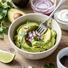 Prepare the avocado: cut each avocado in half around the pit, twist the halves, and remove the pit with a spoon. Scoop the flesh into a medium bowl with a spoon. Add the juice of 1 lime (about 30 g of juice), 1/2 teaspoon of salt (about 1 g), and 1 pinch of pepper. Finely chop 1/2 red onion (about 75 g), 1 clove of garlic (5 g), and 1/2 bunch of cilantro (about 15 g) and add to the bowl. Mash everything with a fork to a chunky consistency (not completely smooth). If the mixture is very thick, stir in 60 g of natural yogurt to achieve creaminess.