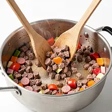 Add the chopped sausage (400 g) to the pot and fry for 6-8 minutes, breaking it into smaller pieces with a wooden spoon until the meat is no longer raw and lightly browned.
