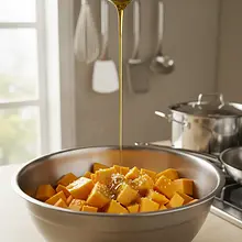 Transfer the chopped pumpkin to a large bowl. Drizzle it with 3 tablespoons of olive oil, season with salt and freshly ground pepper. Mix thoroughly with your hands, ensuring each piece of pumpkin is coated with a thin layer of oil and seasoning. Spread the pumpkin evenly in a single layer on a large baking sheet lined with parchment paper. Place it in the preheated oven and bake for 25-30 minutes, until the pumpkin is tender and slightly caramelized at the edges. You can check for doneness by piercing a piece with a fork - it should go in easily.