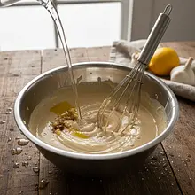 Start mixing the ingredients, gradually adding very cold water, one tablespoon at a time. Stir vigorously until the sauce starts to become lighter and creamy. Continue adding water until you achieve the desired consistency – it should be pourable but still thick, similar to runny yogurt. Season the sauce with a pinch of salt. Additionally, you can add maple syrup to balance the flavor if the tahini is very bitter.