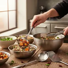 At the bottom of each bowl, place a portion of warm, roasted sweet potatoes. Next to them, add a portion of quinoa salad. Generously sprinkle everything with crunchy chickpeas. Drizzle the entire dish with the prepared tahini sauce. Finally, garnish the dish with a portion of pickled red onion. Additionally, you can sprinkle with pomegranate seeds for color and juiciness. Serve immediately while the sweet potatoes and chickpeas are warm.