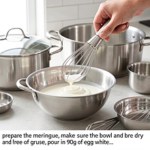 Prepare the meringue: make sure the bowl and whisk are dry and free of any grease. Pour the egg whites (90 g) into the bowl and start beating on medium speed until soft peaks form (about 1–2 minutes). Gradually add the sugar (the remainder from 270 g, which is about 120 g for the meringue) one tablespoon at a time, continuing to beat until the mixture is stiff and glossy — the sugar should dissolve (check by rubbing a bit of the mixture between your fingers: it should not be grainy). Add a pinch of salt (1 g) and beat for another 10–20 seconds.