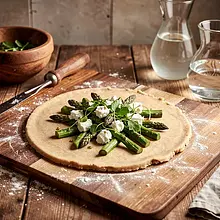 Spring tart combining the Masurian character of simple, local ingredients: slightly nutty rye pastry, green asparagus with delicately spicy goat cheese, and a fresh, tangy sorrel sauce. The dish has a contrast of textures — crispy, baked edges of the pastry, creamy interior of the egg and cream mixture, and juicy, al dente asparagus. Perfect for a family lunch or a light dinner during the asparagus and sorrel season; it pairs wonderfully with young salad and a simple vinaigrette, along with a glass of white wine. Visually, the tart has an intense green color from the sauce and asparagus, accented by white spots of goat cheese — a rustic, Masurian effect.