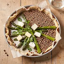 On the pre-baked tart base, evenly spread the sautéed asparagus and onion. Crumble goat cheese (150 g) finely and sprinkle it over the layer of asparagus, leaving a few larger pieces for decoration. Pour the prepared egg and cream mixture so that it reaches about 80% of the height of the tart rim. Place a few whole asparagus on top for decoration.