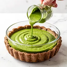 While the tart is baking, prepare the sorrel sauce: rinse the sorrel (120 g) and discard the thick stems. In a small pot, melt 20 g of butter over medium heat, add 10 g of all-purpose flour and stir for 1 minute to create a light roux. Gradually pour in warm vegetable broth (100 ml), whisking until the sauce thickens. Add the sorrel and cook for 2–3 minutes until the leaves wilt. Remove from heat, blend until smooth with an immersion blender, and mix with 100 g of 18% cream — season with salt and pepper to taste. The sauce should be creamy, green, and slightly tangy.